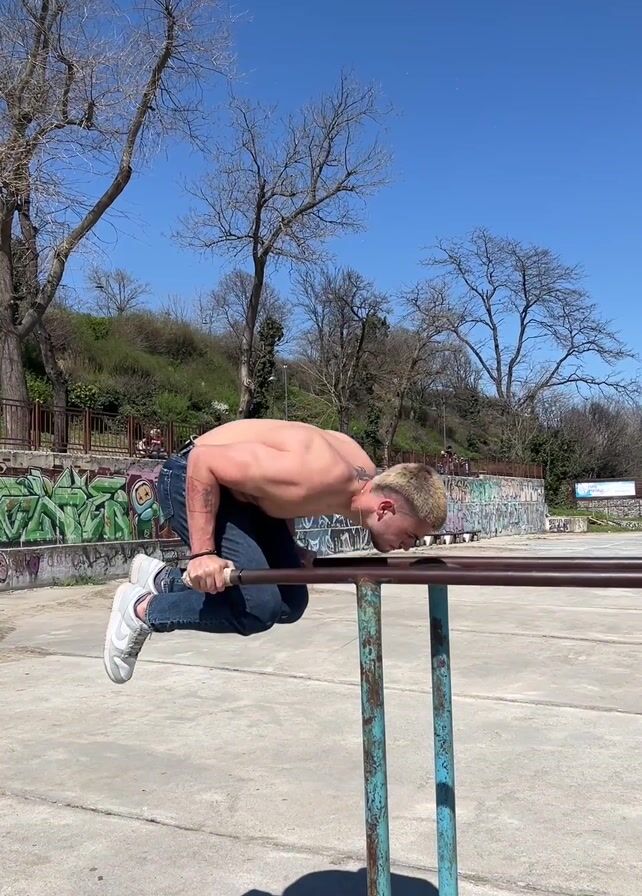 A young, shirtless man is exercising on parallel bars outside on a sunny day. He is wearing jeans and white sneakers. The bars are metallic blue and the ground is concrete. Behind him is a low wall covered in graffiti, with trees beyond that. The sky is a clear blue. He is performing a type of bent-over row exercise.