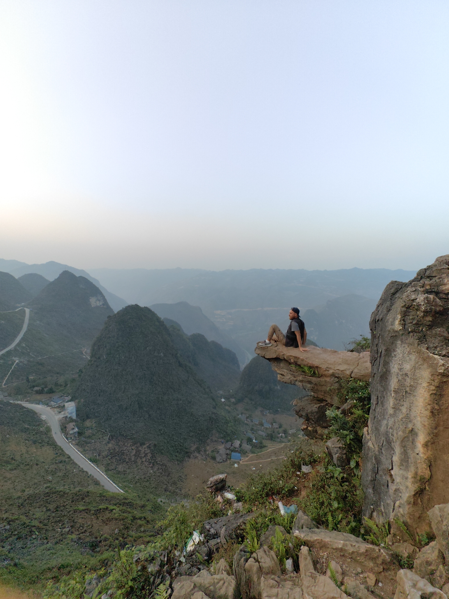 A vertical, eye-level shot captures a man seated on a precipice overlooking a valley landscape in Đồng Văn Commune, Vietnam. The sky is a pale blue gradient fading to a light orange near the horizon. The man, wearing a dark cap, vest, and light pants, sits with his legs dangling over the edge of the rocky outcrop. The rock formation he is sitting on is rough and textured, with some vegetation growing near its base. Below, a winding road cuts through the mountainous terrain. The mountains are covered in green vegetation. In the distance, a hazy vista of more mountains stretches towards the horizon. Closer to the viewer, there is trash scattered on the ground.