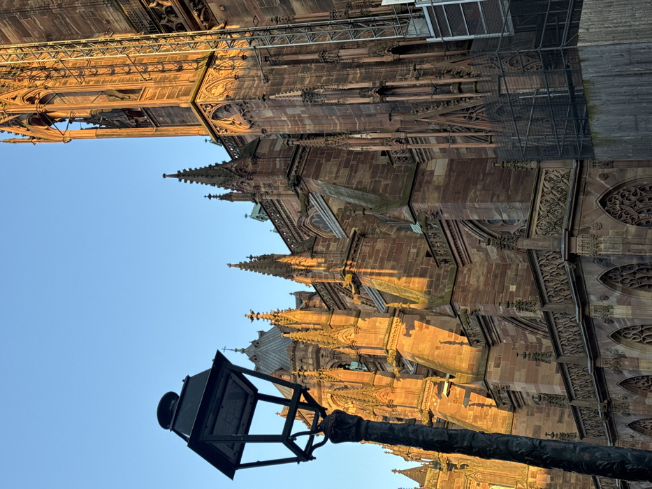 The image displays a detailed view of a section of the Strasbourg Cathedral (Cathédrale Notre-Dame de Strasbourg) in Strasbourg, France, under a clear blue sky. The cathedral, constructed from reddish-brown sandstone, is illuminated by warm, golden sunlight from the right, casting shadows that accentuate its intricate Gothic architecture. In the foreground, on the left, a dark, ornate streetlamp post with a traditional lantern head stands vertically, partially obscuring the cathedral facade. The cathedral itself features numerous spires, pinnacles, flying buttresses, and multi-level walls adorned with detailed carvings, tracery, and arched windows, including rose window patterns at lower levels. Decorative balustrades line various ledges. Several gargoyles are discernible protruding from upper sections of the architecture. On the far right side of the cathedral, a metallic scaffolding structure, possibly for maintenance or restoration, extends vertically. The lower part of this scaffolding is partially covered by a dark protective mesh and obscured by light-colored wooden paneling at its base. No individuals, vehicles, or specific ground-level street details are visible within the frame.