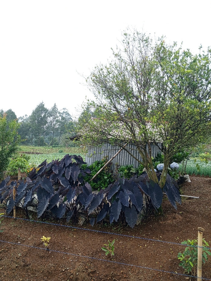 A landscape showcases a taro plant with large, dark purple leaves, thriving in a garden setting. Behind it stands a corrugated metal structure. A tree, partially obscuring the shed, displays green foliage and bare branches. The ground is earthy, dotted with sparse vegetation. In the background, a field stretches towards a line of trees under a cloudy sky. A simple wire fence runs along the garden's edge in the foreground.