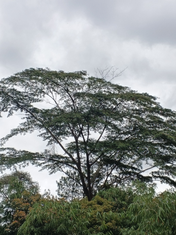 A large tree dominates the frame under a cloudy sky. Its broad, umbrella-shaped canopy is comprised of many small, green leaves, creating a dense textured effect. Several thick branches extend outward from the trunk. Below the main tree are other, smaller trees and greenery with a mix of shades, including some bamboo shoots, creating a multi-layered effect. The overall tone is muted due to the overcast conditions.