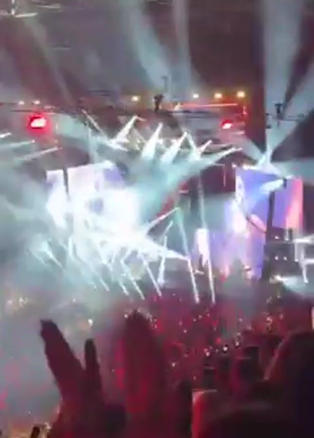 crowd of people at a concert. Many people are raising their hands. The stage is lit up with bright lights and what appears to be smoke. The scene is brightly lit.