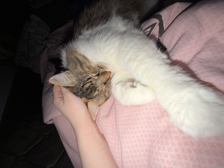 - "A fluffy cat with brown and white fur lies on a person's chest, nestled in their arm" by FM-3WDDJ2, licensed under CC BY 4.0