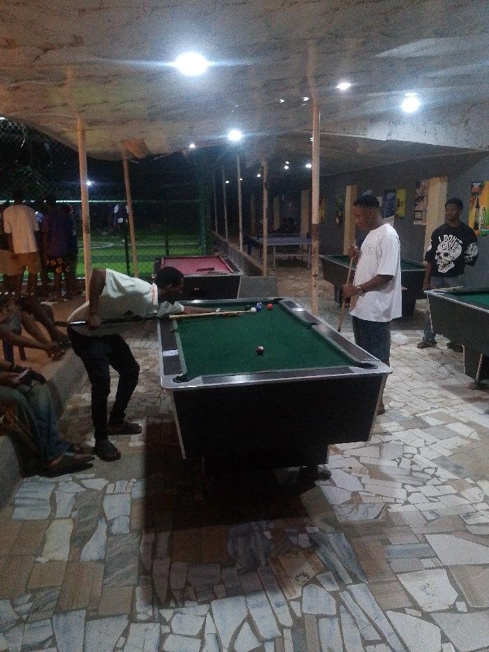 - "A group of people are gathered in an outdoor entertainment space, where multiple pool tables stand on a patterned tile floor" by FM-kLrsY2, licensed under CC BY 4.0