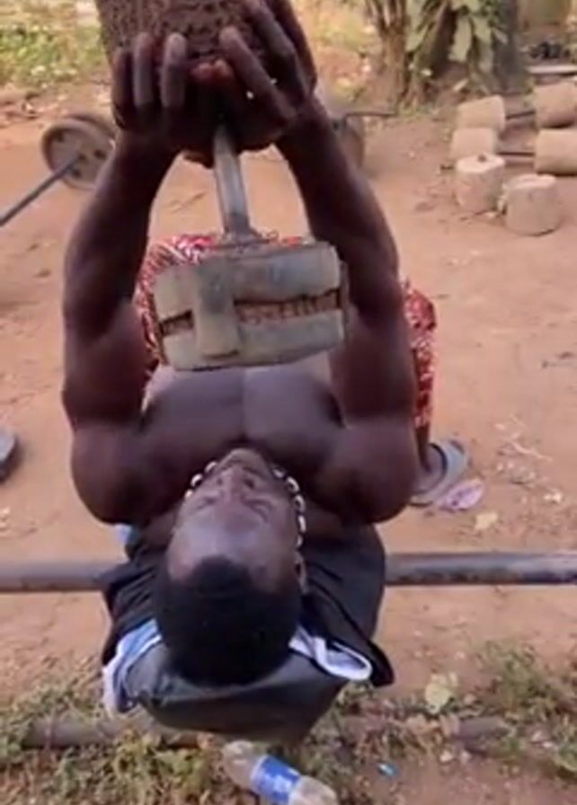 A man with a muscular physique is shown in an outdoor setting doing chest presses. He is lying on a weight bench with a barbell rack behind him on each side of the bench. The man is holding a homemade-looking dumbbell that appears to be constructed from metal gears or sprockets. He is wearing a patterned garment around his waist. There are old tires and metal weights scattered around on the dirt ground. A water bottle is on the bench beside the man.