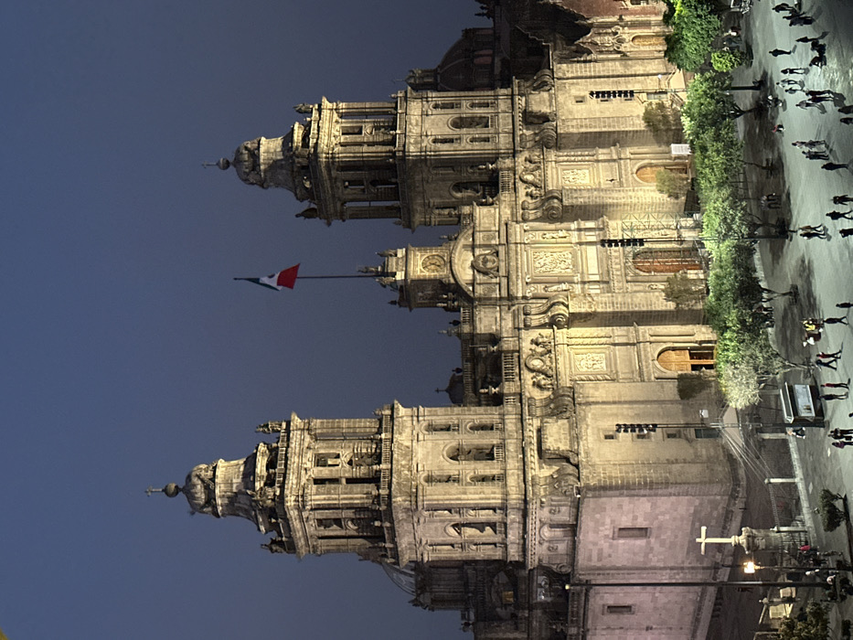 A grand cathedral dominates the scene, illuminated against a twilight sky. Architectural details include ornate carvings and towering spires. A Mexican flag flies nearby. A plaza stretches along the cathedral's side, filled with indistinct figures of people. Trees line the edge of the plaza, adding a touch of greenery to the urban landscape. The perspective is from below, emphasizing the cathedral's imposing presence.