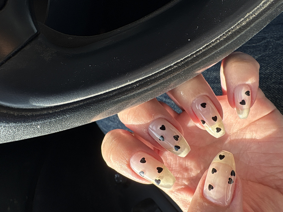 A light-skinned left hand is prominently featured in a close-up, illuminated by strong sunlight. The hand exhibits five long, coffin-shaped fingernails, each with a clear base, a light yellow tip, and multiple small black heart decals. A portion of blue denim fabric, likely jeans, is visible in the lower left. On the right side of the frame, a textured black surface, consistent with a vehicle's steering wheel or dashboard, is visible. The scene takes place within what appears to be a car interior during daylight hours. No discernible features within the image allow for the identification of a specific location within Tel Aviv, Israel.