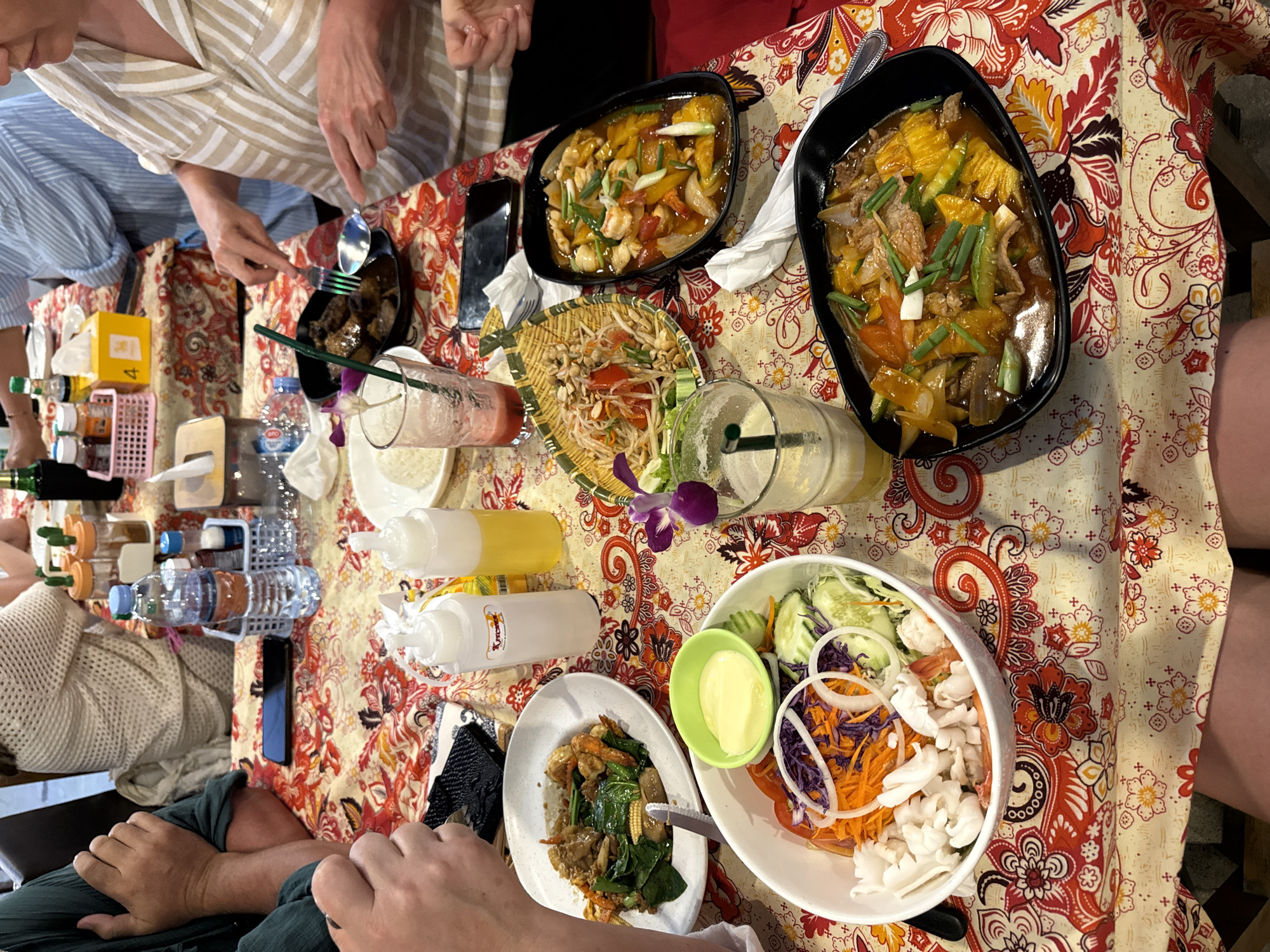 A high-angle shot depicts a table covered with a vibrant, patterned tablecloth, laden with various dishes and beverages, suggesting a meal taking place in Kamala, Thailand. At the top left, a person in a striped shirt is seen holding a spoon and fork, possibly serving themselves. Another individual, wearing green, is visible at the bottom left, with hands near a plate of stir-fried vegetables and seafood. Dishes include a papaya salad in a fish-shaped basket, a large salad with shredded carrots, cabbage, cucumbers, onions, and mushrooms, and two black bowls containing what appears to be sweet and sour stir-fries, one with chicken or shrimp and the other with pork. Beverages consist of a few glasses of pink and yellow colored drinks, bottles of water, and possible condiments. Utensils and various small containers are scattered across the table. The overall scene conveys a shared meal in a casual, potentially outdoor, setting.
