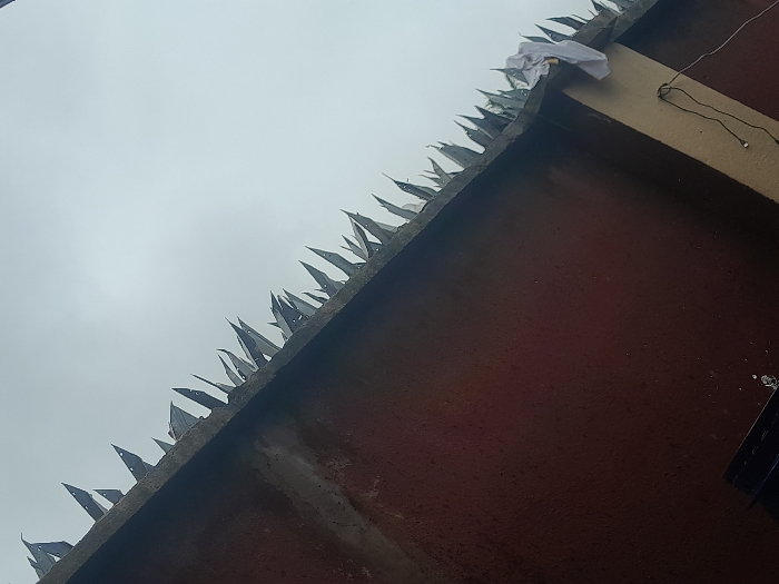 This image, taken in the city of Ukwu-Abwa, Nigeria, shows a weathered, dark reddish-brown concrete security wall from a low-angle perspective against a uniformly light gray, overcast sky. The top edge of the wall is fitted with numerous irregularly shaped, sharp metal spikes, functioning as anti-climb deterrents. On the right side, a beige or off-white concrete pillar supports the wall. A crumpled white cloth is draped over the spikes and the wall's edge near this pillar. Black electrical wires hang loosely down the side of the pillar. A dark, indistinct object and some white specks are partially visible at the bottom left of the frame. No individuals are present, and no actions or interactions are depicted.
