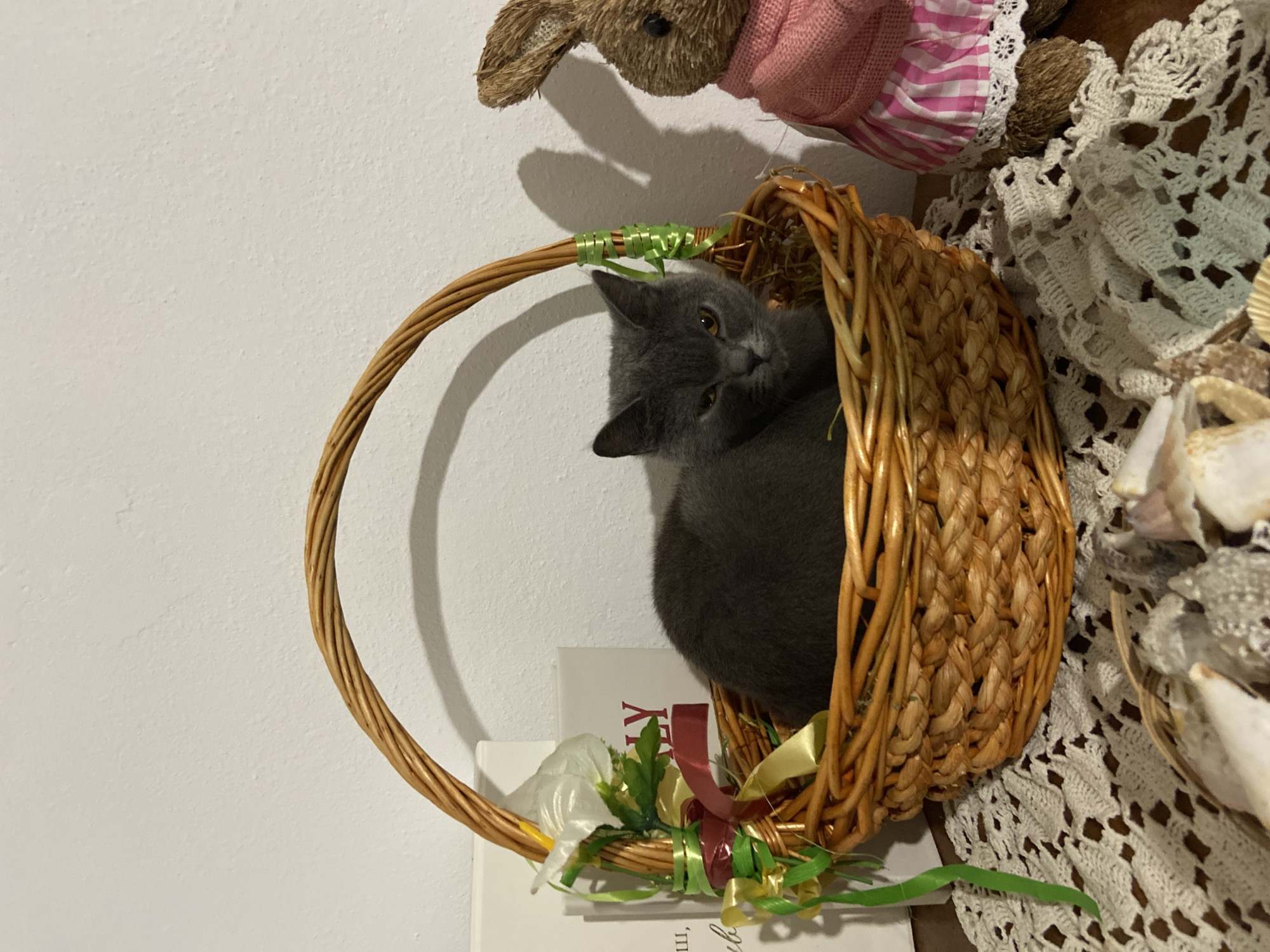 - "A gray kitten sits in a woven basket, which is decorated with ribbons and artificial flowers" by FM-Ftqzb2, licensed under CC BY 4.0