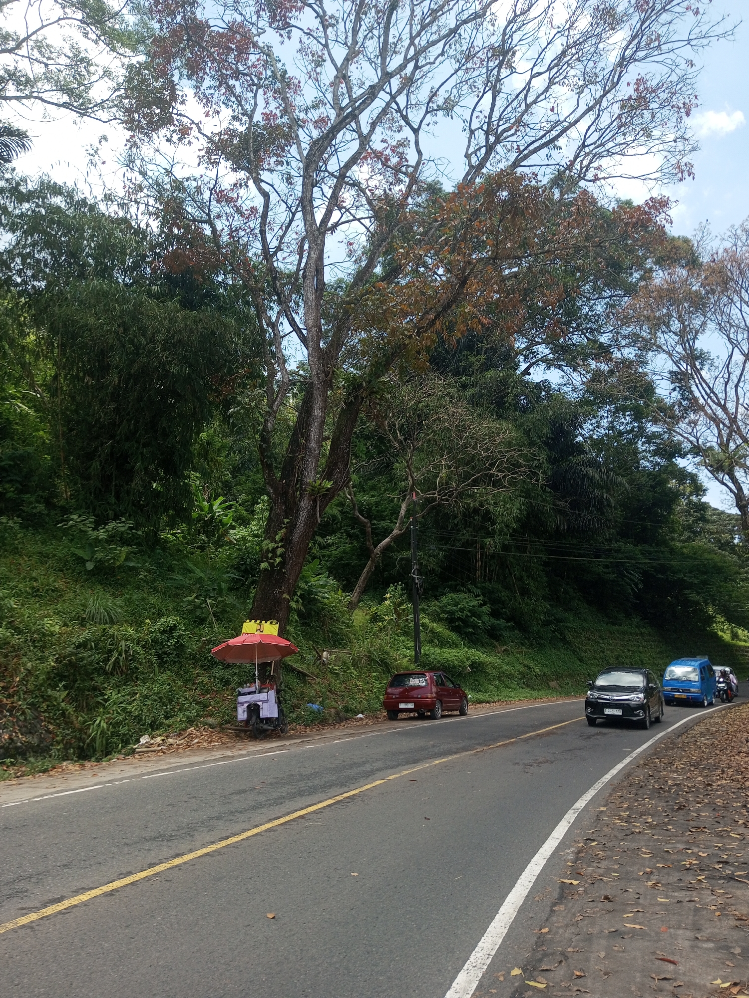 - "Captured along a winding road outside Kioumaknao 2, Laos, the scene depicts a roadside snack vendor positioned under a red umbrella next to a large tree" by FM-5Z6bi2, licensed under CC BY 4.0