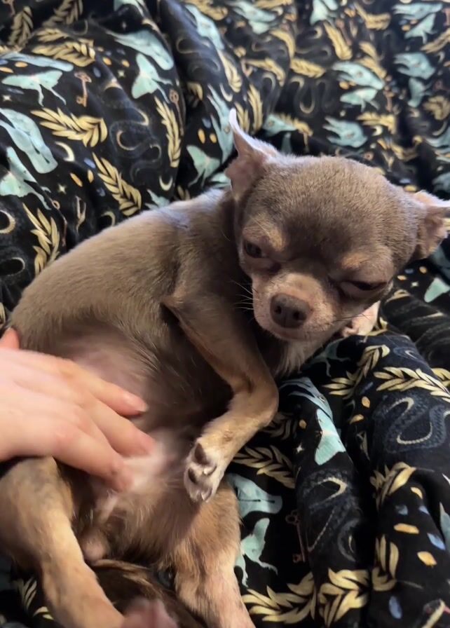 small, brown Chihuahua lying on a bed with a patterned blanket. A hand gently pets the dog's stomach. The dog is mostly still, with its eyes half-closed and a relaxed expression. The background is out of focus, but it appears to be a bedroom setting.