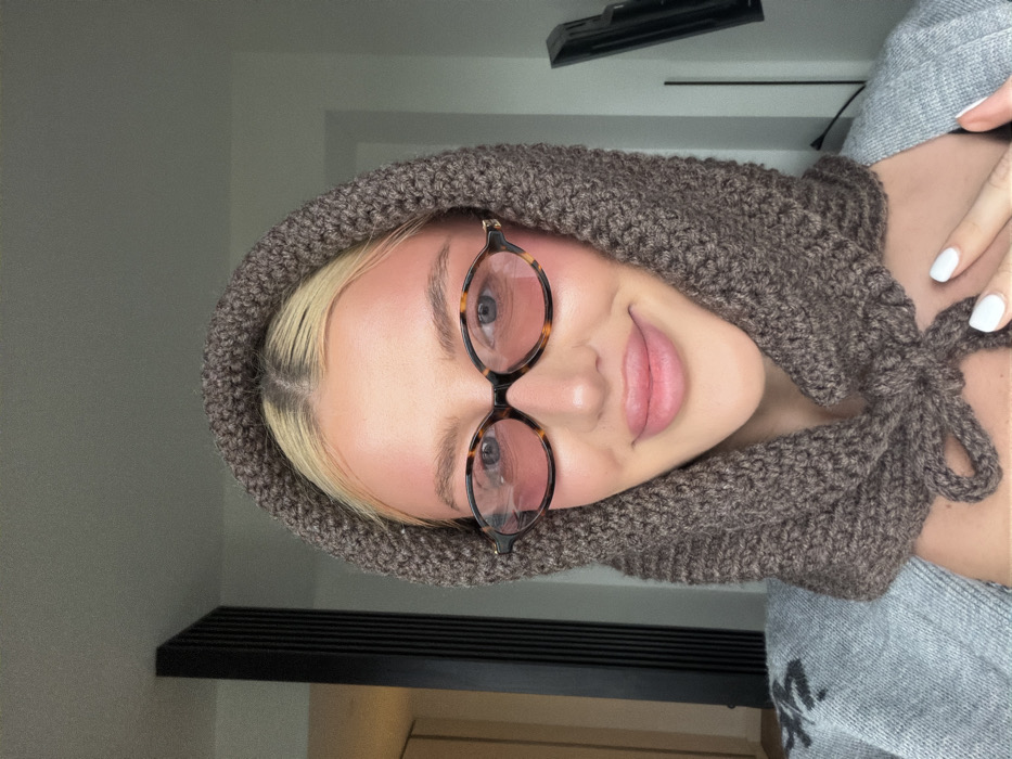 The image depicts a close-up indoor portrait of a female subject, observed in Belgrade, Serbia. The subject has blonde hair, a fair complexion, and prominent blush on her cheeks. She wears oval-shaped tortoiseshell-patterned eyeglasses with pink-tinted lenses. Her lips are full, and she displays a slight smile while looking directly into the camera. She is dressed in a dark brown, textured knitted hood or balaclava, which is tied under her chin. A light grey knitted garment, possibly a cardigan, is visible over her left shoulder. Her right hand, with white painted nails, rests near her collarbone. The background on the left features a dark, vertical slatted panel, while a dark, vertical object, possibly a screen or monitor in profile, is partially visible on the right.