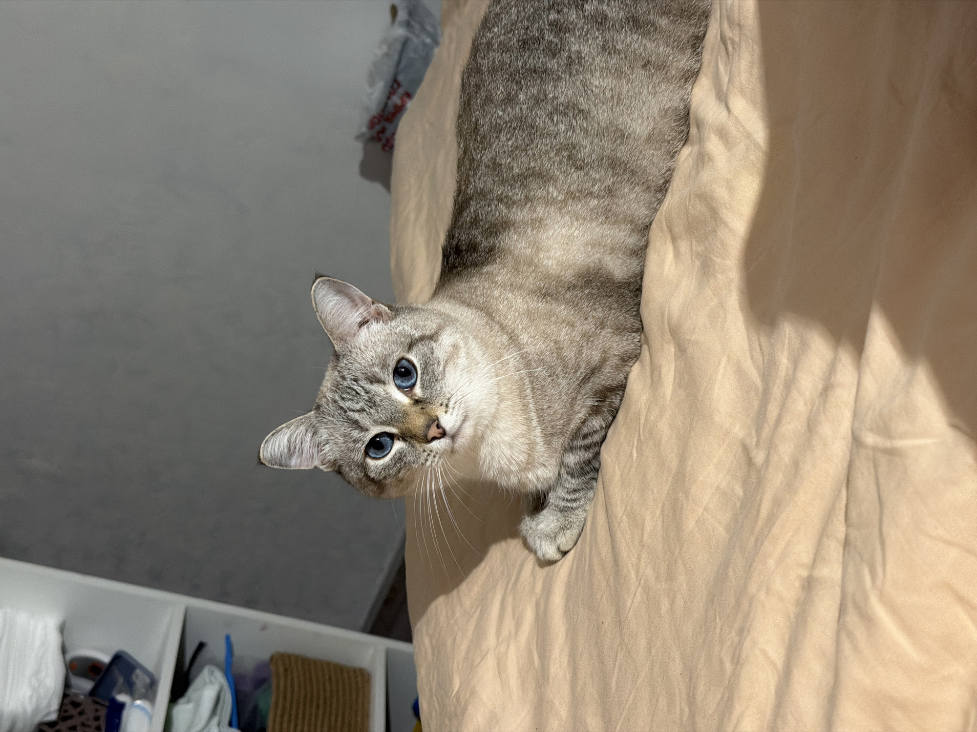 A close-up, slightly tilted, eye-level shot shows a lynx point cat lying on a beige, possibly wrinkled, bed sheet