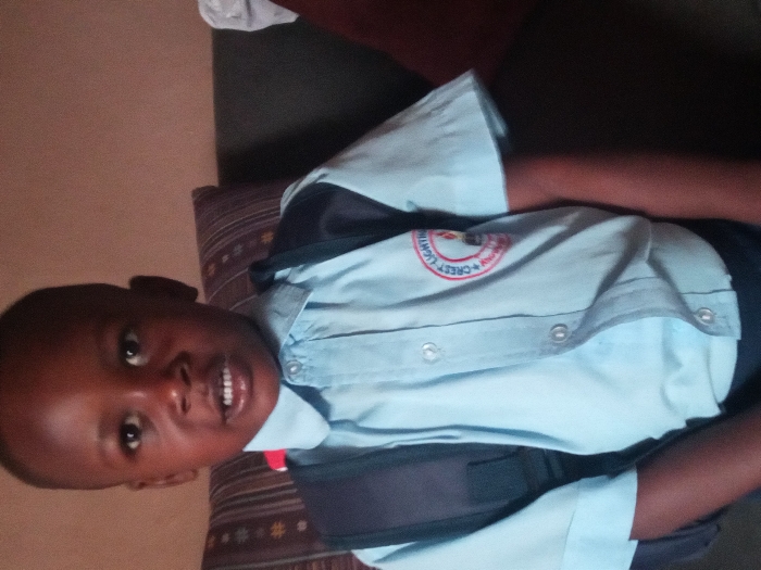 A young boy with dark skin and short hair is photographed in a light blue collared shirt with a school emblem on the left side