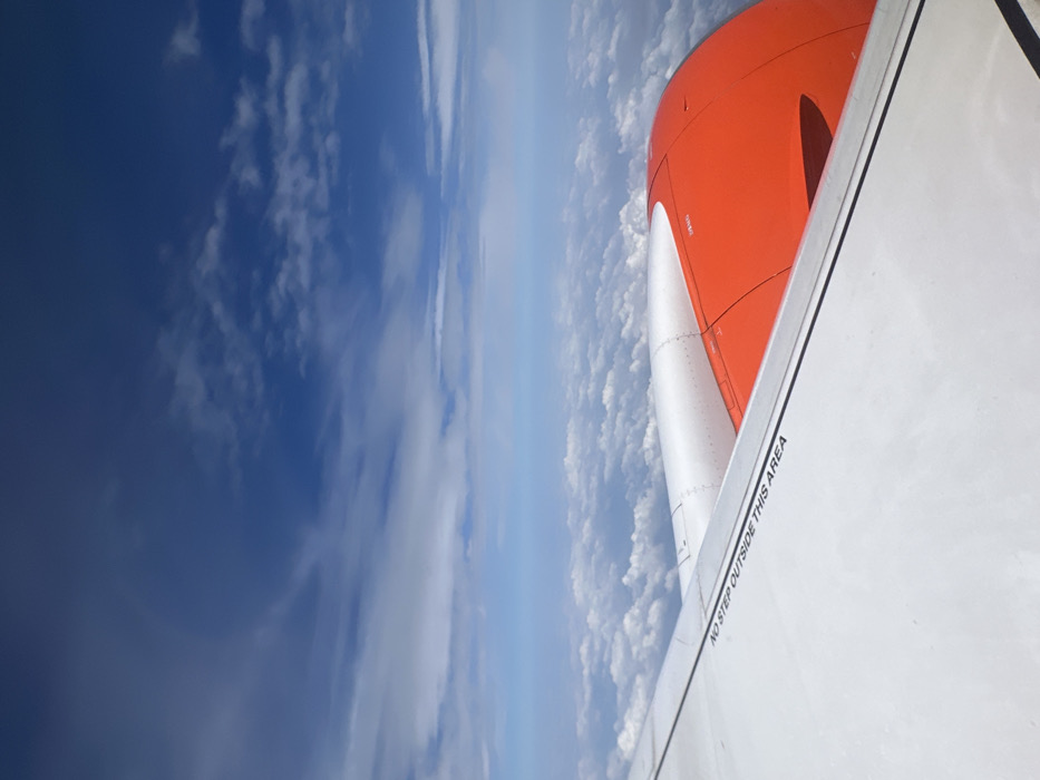 This image presents an aerial view from an aircraft above the city of Ajao, Nigeria. The upper portion of the scene is dominated by a deep blue sky, interspersed with scattered wispy white clouds. Below this, a dense, expansive layer of white cumulus and stratocumulus clouds forms a continuous deck, stretching to the horizon. In the lower right quadrant, a section of the aircraft's white wing is visible, bearing the black warning text "NO STEP OUTSIDE THIS AREA." Attached to the wing is an engine nacelle, prominently featuring a bright orange casing with a white forward section. No individuals are visible. The action depicted is an aircraft in flight at cruising altitude, situated above a substantial cloud formation.