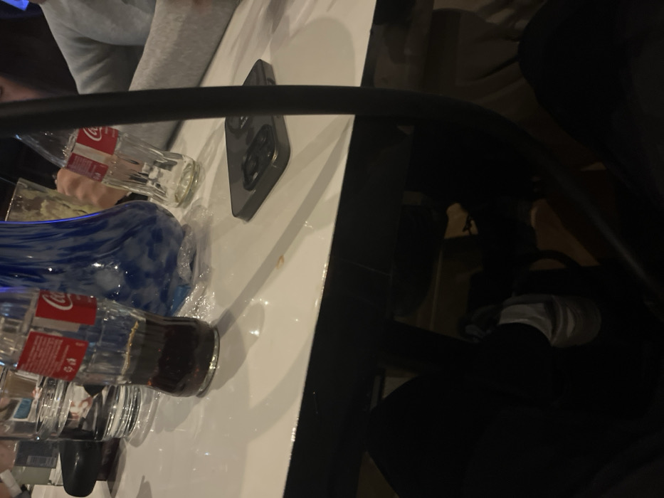 The image depicts an indoor scene focused on a white table surface in what appears to be a cafe or lounge in Stara Zagora, Bulgaria. The specific establishment within the city is not identifiable. On the table, there is a glass Coca-Cola bottle approximately one-third full of dark liquid, an empty glass Coca-Cola bottle, a large blue vase-like object consistent with a hookah base, wrapped in clear plastic film around its neck, and a clear drinking glass containing liquid. A black smartphone, likely an iPhone given its camera array, rests face down in a dark case. A black lighter is also visible. The white table surface shows minor smudges or residue. Partially visible individuals include an arm with a grey sleeve on the right side of the frame and obscured hands/arms behind the blue vase. Below the table, the legs and feet of at least two persons are discernible in shadow, with one individual wearing dark trousers and white shoes/socks. No specific actions or interactions are fully captured.