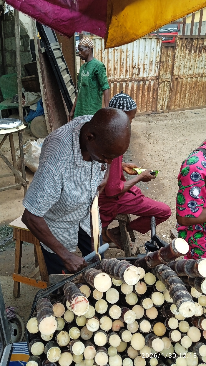 This image depicts an outdoor scene in Ijaiye, Nigeria, specifically a sugarcane vending stall