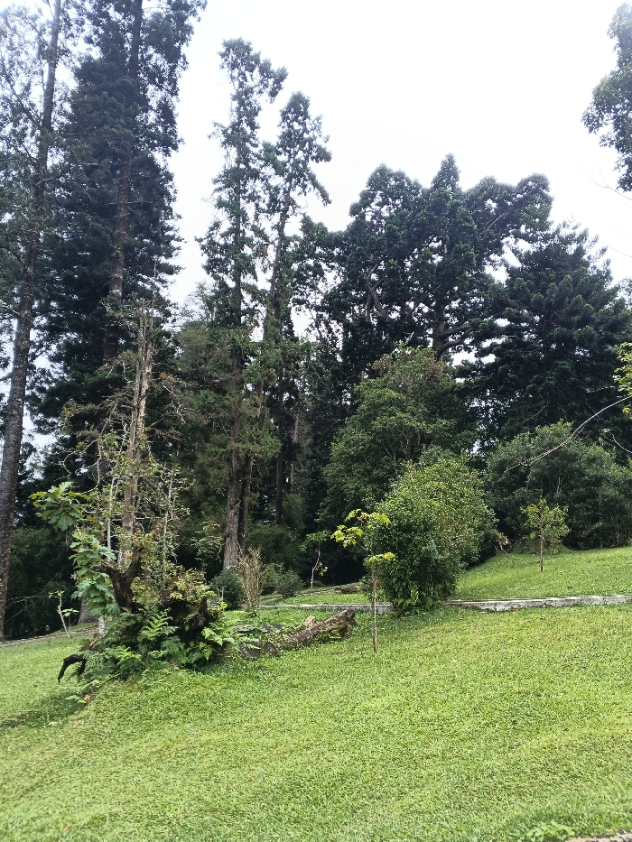This image captures a sloped, well-maintained grassy area within Kwekwe, Zimbabwe, featuring a dense background of trees under an overcast sky. In the foreground, a vibrant green lawn ascends gently from left to right. The midground on the left contains a fallen tree trunk, partially covered by ferns and other green foliage. To the right, a segment of a path or walkway with a concrete or stone border is visible, winding uphill. Scattered across the midground are several small, young trees or shrubs. The background is composed of a dense cluster of tall evergreen trees, primarily dark green conifers, with some exhibiting visible bare branches. The sky above is uniformly light gray, indicating overcast conditions. No individuals or animals are present in the scene.
