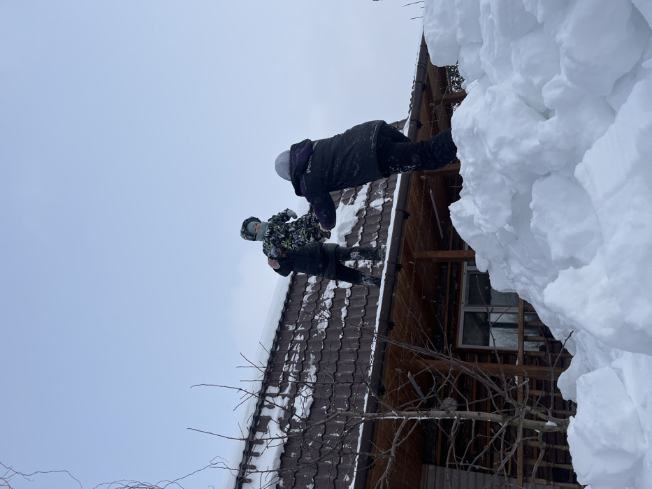 The image, captured in Italmas, Russia, depicts a winter scene featuring three individuals near a snow-covered house. In the foreground, a large, uneven mound of white snow occupies the lower right quadrant, forming an elevated surface. Standing on this snow mound, facing left, is an individual in dark winter attire, including a jacket with "Pocт" (Cyrillic for "Post" or "Rostelecom") visible on the back, black pants, and a light-colored hood. This individual extends their arms upwards. To the left, on the edge of a snow-laden, brown-tiled roof, a child wearing a patterned (green, blue, white) winter suit and a light-colored balaclava or face mask is suspended. The child's legs hang freely. Partially visible behind and to the left of the child, on the same roof, is a third individual in dark winter clothing, appearing to hold or support the child from behind. The house features a wooden siding and a porch structure beneath the roof, with visible windows. Bare tree branches are present on the left side of the frame. The sky is uniformly overcast and light gray. The scene indicates heavy snow cover and cold weather conditions, with an apparent transfer or assistance of the child between the roof and the elevated snow pile on the ground.