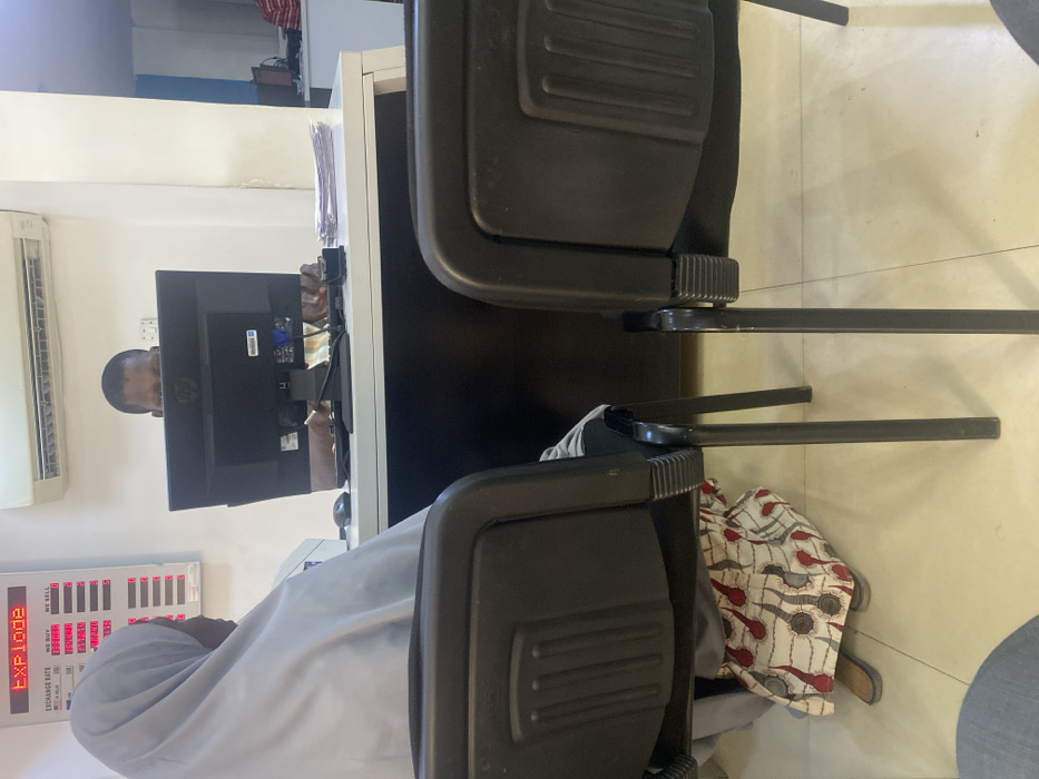 The image depicts an indoor scene within a commercial establishment in Dadi Riba, Nigeria, likely a currency exchange office or bank