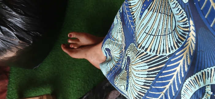 The scene depicts the lower extremities of an individual in Sabon Gari South, Nigeria. The subject's feet are crossed at the ankles, resting on a surface covered with green artificial turf. The skin tone of the feet is dark, and toenails are painted with a dark red polish. A fabric garment, possibly a skirt or dress, with a blue, light blue, and gold geometric pattern, covers the lower lap and upper legs. In the upper right background, a large, dark, crumpled object, consistent with a black plastic bag or tarp, is visible. A small section of a light brown object is present in the upper left background. No other individuals or interactions are discernible.
