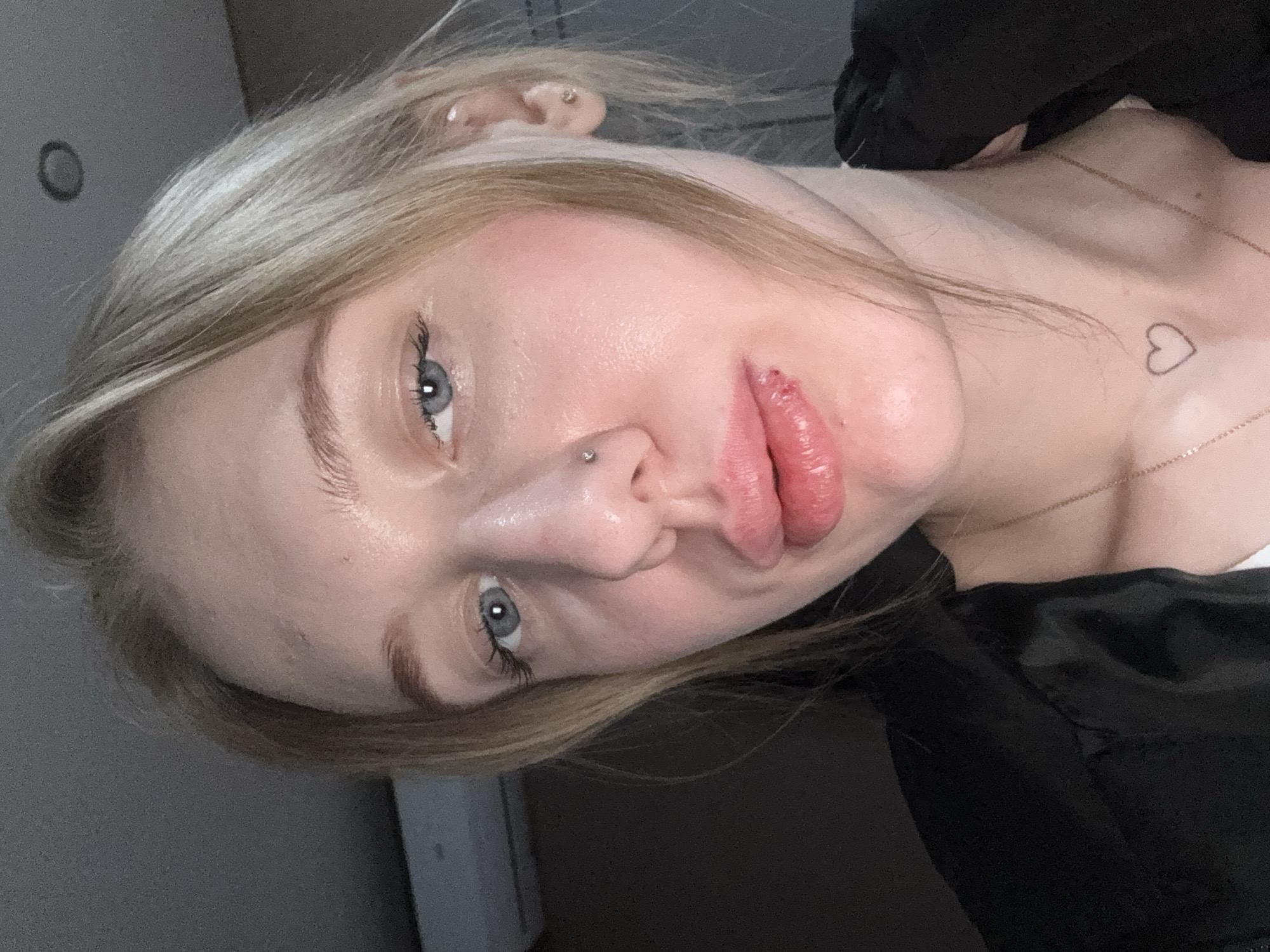 The scene depicts a close-up, chest-up indoor portrait of a young adult female, located in what is assumed to be the city of Novoalexandrovka, Russia. The individual has blonde hair and blue eyes, looking directly at the camera. A small silver stud piercing is visible in her left nostril, and a small stud earring is present in her right ear. Her lips appear full, with a reddish lesion or dry patch observed on the lower lip towards the viewer's left. A small, outline heart tattoo is located on the left side of her neck/collarbone area, above a thin gold-colored chain necklace. She is dressed in a black top or jacket, worn over a lighter-colored garment. The background consists of a dark, undifferentiated wall, a light grey ceiling with a visible circular recessed light fixture in the upper right, and a white, rectangular wall-mounted unit, consistent with an air conditioning unit, positioned in the upper left.
