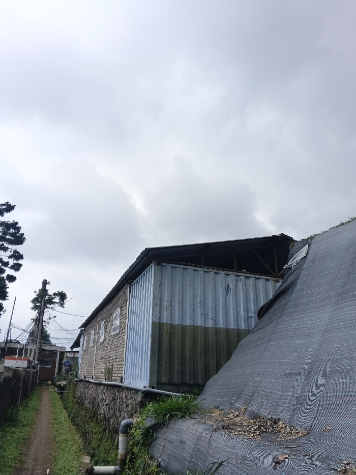 The scene depicts an outdoor environment in Uato Carabar, Timor-Leste, under an overcast sky. A narrow dirt path is visible along the lower left quadrant of the image. To the right of the path, a low retaining wall constructed of stone and concrete supports an elevated area. On this elevated area, a structure with a light-colored brick facade is visible, featuring multiple rectangular openings resembling windows. This building has a dark corrugated metal roof. Adjoining or integrated with the brick structure is a section made from what appears to be a modified shipping container, painted light blue on its upper half and dark olive green on its lower half, also topped with a dark corrugated metal roof extending from the main building. In the background, further along the path, a utility pole with multiple overhead wires is present. A portion of a dark green coniferous tree is visible on the far left. On the right side of the image, a large area of dark grey/black mesh fabric or netting covers a steeply sloped surface, with scattered dry leaves and vegetation resting on it. A grey PVC pipe runs horizontally along the base of the retaining wall and extends towards the mesh-covered slope. No individuals are present.