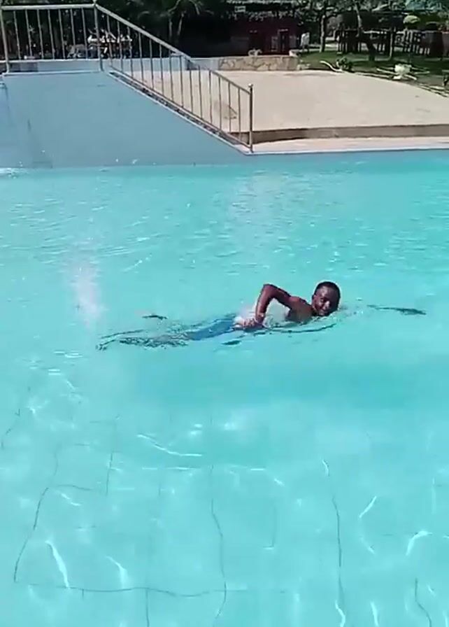 man swimming in a pool. He uses an overhand stroke. The pool has a light blue tile bottom, and the water is clear and a lighter blue. The pool is surrounded by a tiled deck area with a metal railing. Beyond the deck are trees, shrubs, and covered seating areas. The video appears to be taken during daylight.