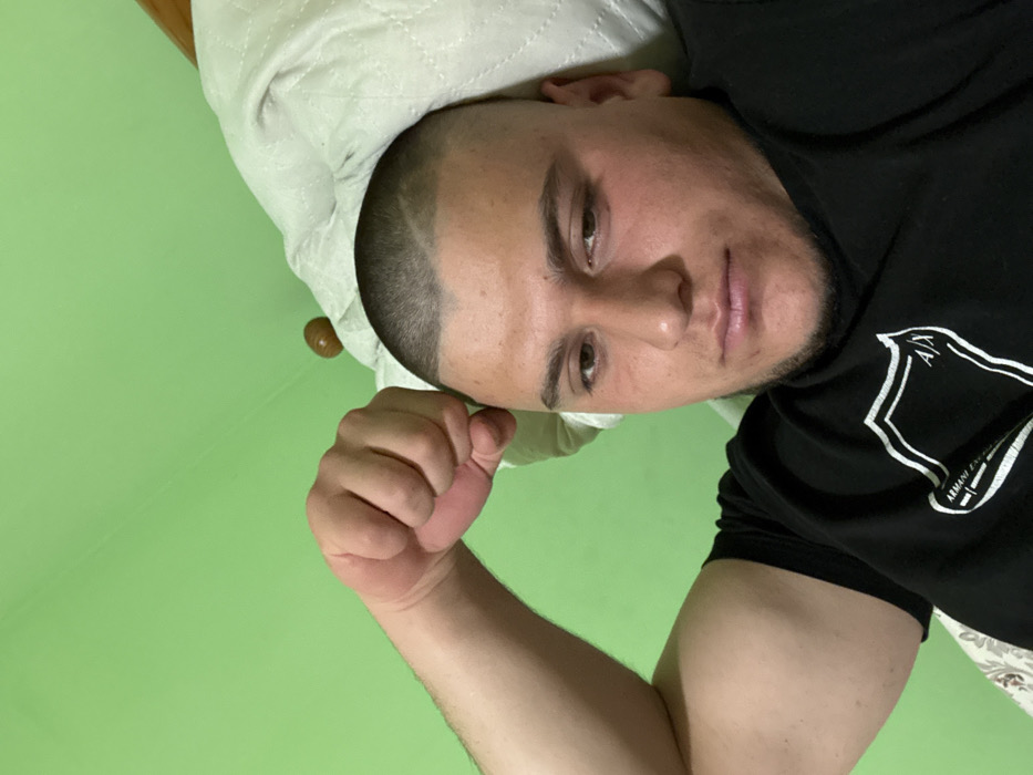 A male individual is depicted in an indoor setting, identified as the city of Devnya, Bulgaria. The subject has short, dark, closely-cropped hair with a distinct shaved diagonal line on the right side of his scalp. He is wearing a black t-shirt featuring a white "ARMANI EXCHANGE" logo on the chest. He is positioned against a white quilted pillow, likely on a bed, with a light brown wooden element of a headboard visible behind the pillow. His right arm is bent, with his hand clenched into a fist, indicating a flexed bicep. The subject maintains direct eye contact with the camera. The background wall is painted a solid lime green.