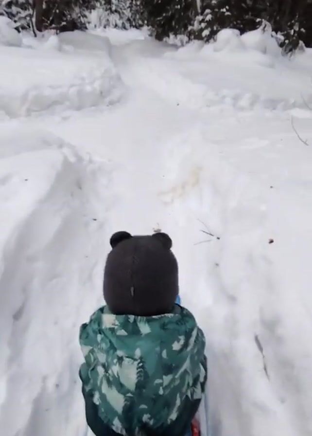 A young child in a hooded, patterned jacket and a dark knit hat with bear ears is sitting on a red and blue sled, being pulled through a snow-covered path in a forest. The camera is positioned behind the child, capturing the view ahead. The snow-covered path winds between snowbanks and trees. An adult's gloved hands are visible at the bottom of the frame, holding the sled's handle. The child is making sounds, possibly enjoying the ride. The environment appears to be a winter scene with thick snow covering the ground and trees.