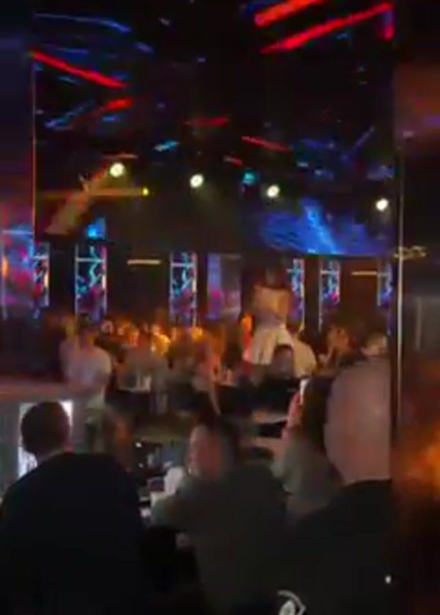 The scene takes place in a dimly lit nightclub, crowded with people