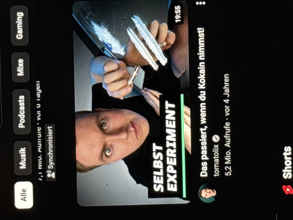 The image displays a digital screen, likely a mobile device, presenting a video platform interface. The dominant feature is a video thumbnail depicting a Caucasian male, approximately 20-30 years old, with short light hair and wide, startled blue eyes, staring directly forward. He wears a dark garment. His right hand, partially visible on the right side of the frame, holds a small, metallic, cylindrical object over a dark, reflective surface. On this surface, three distinct lines of white crystalline powder are arranged: one broader line is positioned further back, and two narrower, parallel lines are closer to the foreground. A black banner with green text overlay reads "SELBST EXPERIMENT" (Self Experiment). A digital timer "19:55" is visible in the bottom right of the thumbnail. Below the thumbnail, the video's title, "Das passiert, wenn du Kokain nimmst!" (This is what happens when you take cocaine!), is displayed. The video is from the "tomatolix" channel, indicated by a profile picture matching the man in the thumbnail and a verified badge. Statistics show "5,2 Mio. Aufrufe • vor 4 Jahren" (5.2 million views • 4 years ago). The top section of the interface includes navigation tabs such as "Alle" (All), "Musik" (Music), "Podcasts", "Mixe", and "Gaming," along with a "Synchronisiert" (Synchronized) button. The very bottom shows a "Shorts" section label. The image captures a digital display and does not contain any visual elements that identify a specific physical location within Kassel, Germany.