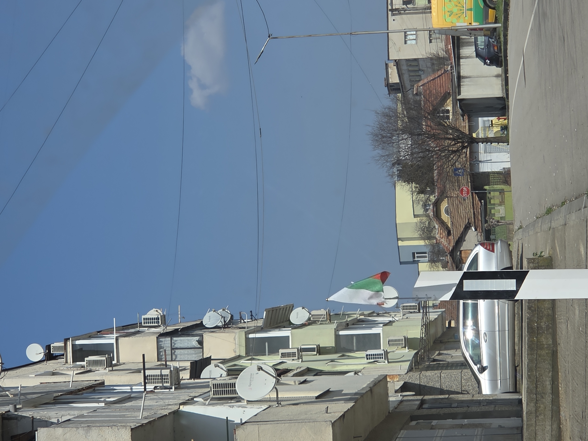 The image depicts a daytime street scene in Pavlikeni, Bulgaria. On the left, a multi-story, weathered building, likely an apartment block, dominates the frame. Its facade is light-colored and features multiple windows, concrete balconies, numerous external air conditioning units, and several white satellite dishes, one bearing the inscription "Булелсатсом." A Bulgarian flag, displaying horizontal white, green, and red stripes, flies from a pole attached to this building in the mid-left. In the foreground, a black and white striped traffic guidance post stands centrally on a concrete sidewalk. A silver Mercedes-Benz C-Class (W203) station wagon is parked on a raised concrete area adjacent to the multi-story building, partially obscured by the traffic post. A paved road extends from the foreground into the background, with a white painted line visible on its surface. To the right of the road in the midground, a bare deciduous tree stands in front of a cluster of single-story houses with red tiled roofs. A red "STOP" sign is affixed near one of these houses, accompanied by a blue square sign indicating a pedestrian crossing. A black hatchback vehicle is parked next to a yellow and green utility van further down the street. The background reveals additional multi-story buildings of varying colors and architectural styles. The sky is clear and blue, with several dark utility lines stretching horizontally across the upper portion of the frame and a single white cloud visible in the lower right sky. A street light pole is present on the right side of the image. No individuals are visible.