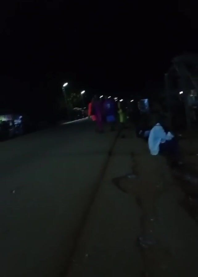 At night, a camera moves down a dark street, passing under streetlights. There are buildings to the right, with lights on inside. People are standing around in front of the buildings. There are motorbikes parked in front of a building painted yellow, blue, and red. A person in a red shirt carries someone, perhaps a child, in their arms, walking toward the building.