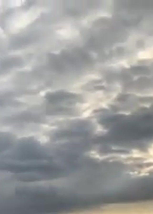 cloudy sky. The sky is filled with gray and white clouds. The sun is trying to peek through the clouds, creating a light glow. The ocean can be seen in the distance. A tree branch is visible in the foreground. A person's face appears briefly at the beginning of the video.