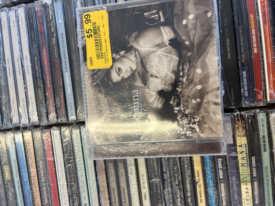 The image captures a detailed close-up of numerous compact disc (CD) albums displayed in a retail setting within the city of Edmond, United States. The CDs are primarily stacked horizontally and vertically, forming dense columns and rows. Most discs are encased in clear plastic wrap. In the foreground and centrally positioned is a Madonna "Like a Virgin (Remix)" CD album. Its cover displays a black and white image of Madonna. A bright yellow sticker is affixed to the upper right of this album, clearly marked "USED $5.99" and includes the text "MADONNA LIKE A VIRGIN (REM MUS - RK1 - WHC)" along with a barcode "000759925157260." Surrounding the central Madonna CD are various other albums. Discernible titles include multiple Madonna albums such as "Rebel Heart," "The Immaculate Collection," "Celebration," and "Bedtime Stories." Other visible artists and titles include "Maroon 5 - Jordi," "Maroon 5 - Call and Response," "Ricky Martin - A Quien Quiera Escuchar," "Melanie Martinez - Portals," "Barry Manilow - Night Songs," "The Mamas and the Papas," and "Dave Matthews Band - Some Devil." The environment appears to be an organized retail display for pre-owned media. No individuals are visible.