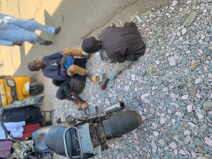 The scene depicts an outdoor roadside area in Maiburiji, Nigeria, illuminated by strong daylight