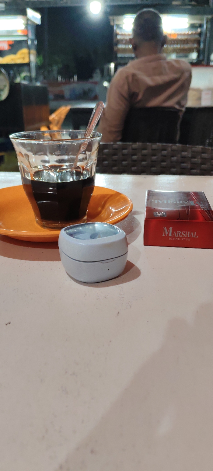 A forensic examination of the image reveals a nighttime outdoor or semi-outdoor setting, likely a cafe or eatery. In the immediate foreground, a clear, faceted glass filled with a dark liquid, presumably coffee, containing a silver spoon, rests on a round orange saucer. To the right of the glass, a small, white, spherical ashtray with a circular indentation on top is positioned. Further right, a red pack of "MARSHAL BLEND TYPE" cigarettes is partially visible, oriented with its text facing the viewer. These objects are situated on a light-colored, textured table surface exhibiting minor surface imperfections. In the midground, a person is seated with their back to the viewer, wearing a light-colored, possibly tan or peach-colored, collared shirt. The person occupies a dark, possibly rattan-style chair, and their head appears to be bald or have a receding hairline. The background is out of focus but shows multiple bright artificial light sources and indistinct structures consistent with food or drink stalls, indicating a bustling environment. The image does not contain any visual information to confirm the specific location as "Cut, Indonesia."