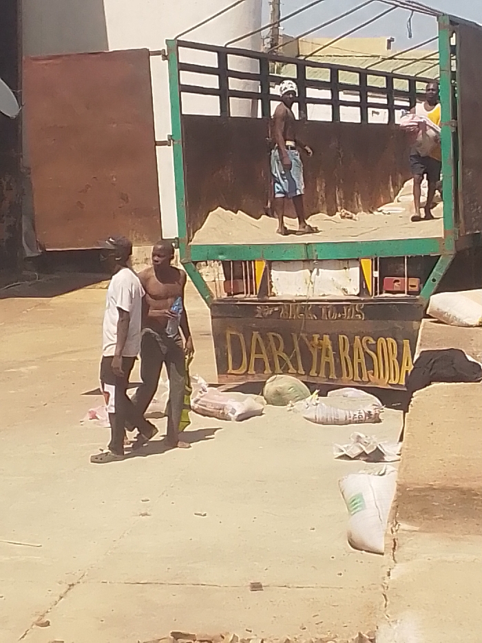 An outdoor scene depicts four adult males engaged with a cargo truck under bright daylight. The truck features a green frame and dark brown cargo bed, with "DARIYA BASOBA" emblazoned in gold letters on its rear. The truck bed contains a substantial pile of light-colored granular material and several white sacks. Two men are on the ground near the truck's rear. The man on the left wears a white t-shirt, dark pants, and a dark cap, facing a bare-chested man in dark pants who holds a clear plastic bottle. Both appear to be conversing. Inside the truck bed, a bare-chested man with a white head covering stands on the granular material. To his right, another man, wearing a yellow tank top and dark shorts, carries a white sack over his shoulder. Scattered on the light-colored, unpaved ground near the truck are several white and light green sacks. A light-colored building with a large open brown door is visible in the background to the left. The location is an unpaved commercial or industrial area in an unknown city.