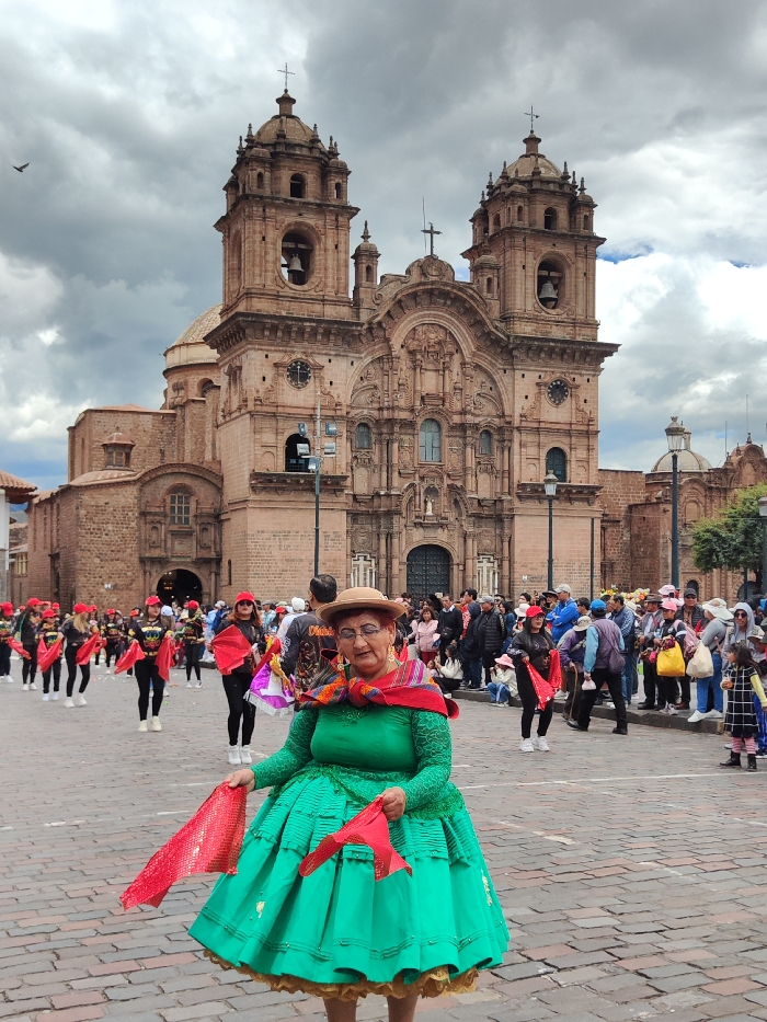 A woman in a traditional green dress and hat stands on a cobblestone street, holding red scarves. Behind her, a group of dancers in black and red attire are in formation. The Plaza de Armas in Cusco, Peru, is visible with its colonial architecture, including the Iglesia de la Compañía de Jesús. A crowd of onlookers is gathered near the church. The sky is overcast with gray clouds.