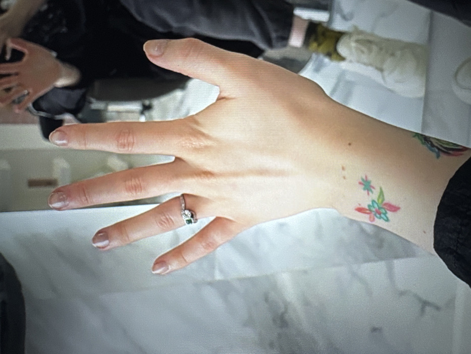 A human left hand is presented in a close-up, centrally positioned, with the palm facing the viewer and fingers slightly splayed. The skin tone is fair. The fingernails are natural, short, and appear unpolished or with clear polish. A ring is worn on the third finger, featuring a silver-toned band with a prominent green central stone flanked by smaller clear stones. On the inner wrist, a colored tattoo depicts stylized floral or star-like shapes in pink, light blue, and green. A partial, multicolored tattoo is also visible further down the wrist, partially obscured by a dark garment sleeve at the bottom of the frame. The background is a reflection in a mirror, revealing a partial view of another individual and an indoor environment. The reflected person wears dark clothing, olive green/yellow patterned socks, and white sneakers, with their hands raised near their head. The reflected environment includes a light-colored, possibly marbled or tiled, surface. No discernible details within the image indicate its geographic location within the city of Jos, Nigeria, or any other specific city.