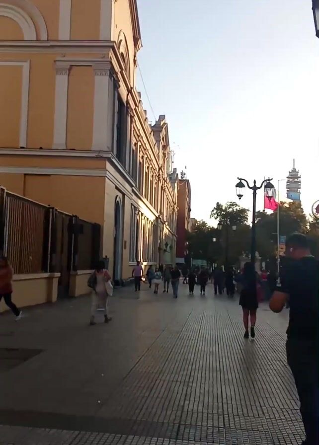 pedestrian walkway in a city on a sunny day. The walkway is paved with small rectangular blocks, and people are walking in both directions. To the left of the walkway is a tall, light-colored building with a classical architectural style. There is a black metal fence alongside the building. On the right side, a series of old-fashioned lampposts line the walkway. Between the lampposts, a Chilean flag is visible. Further down the walkway, the video shows an entrance sign for a "Universidades" subway station and various pedestrians walking. Cars are parked along the road. A red bus can be seen driving by. In the background, taller buildings are visible against the bright sky.