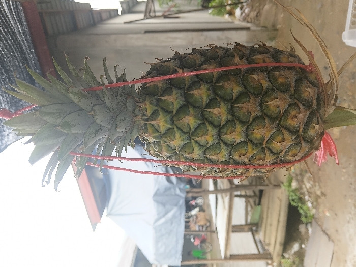 A pineapple rests on its side, bound with red plastic twine. The fruit is green and yellow, its spiky exterior prominently displayed. The pineapple's leafy crown is visible on the left. The background shows an outdoor setting, suggesting a market or roadside stand, with blurred views of structures and objects partially obscured.