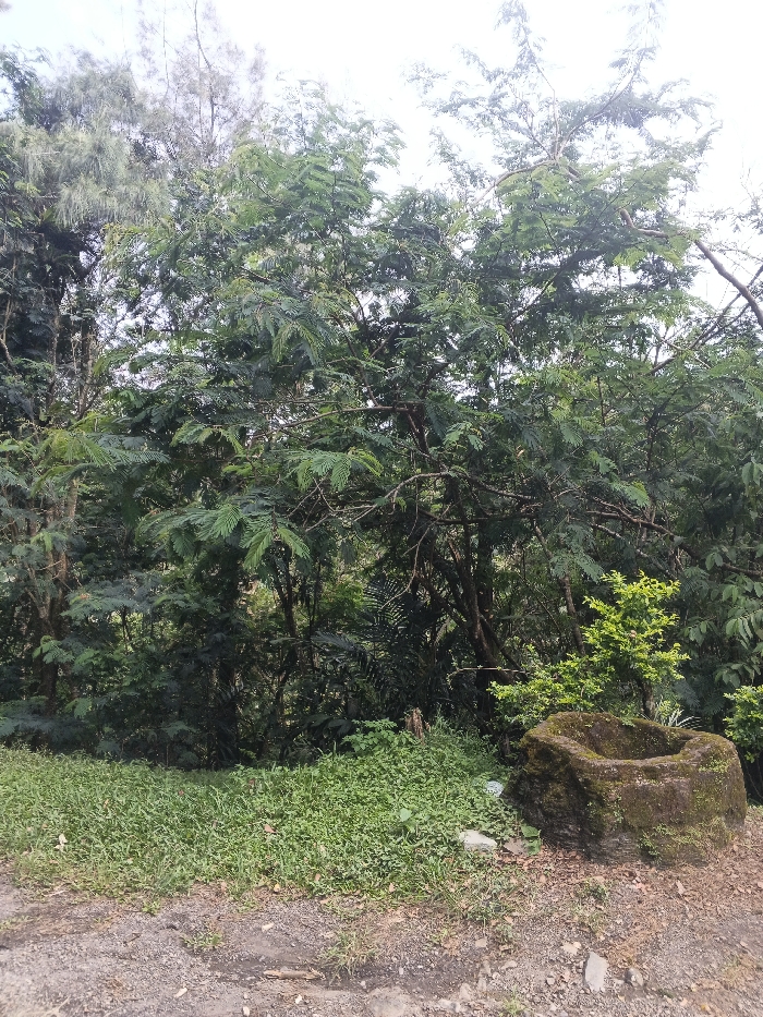 This image depicts a natural outdoor scene in Baglung, Nepal, characterized by dense vegetation and a foreground path. The scene is dominated by a variety of green trees and shrubs forming a dense canopy and undergrowth that fills the background and mid-ground. The foliage varies from broad-leaved trees to those with finer, wispy leaves. In the immediate foreground, a dirt and gravel path or roadside strip extends across the bottom of the frame, showing loose soil, small stones, and sparse organic debris. Adjacent to this path, a patch of vibrant green grass and low-lying ground cover is visible. Positioned on the right side of this grassy area, close to the path, is a solitary, large, weathered stone object. This object is roughly cylindrical, appears hollowed out, and is heavily encrusted with green moss and lichen, suggesting prolonged exposure to the elements. Its internal cavity is visible from the top. The sky, partially visible through the upper tree canopy, appears bright and uniformly light, indicating an overcast or diffused daylight condition. No human figures or animals are present, and no explicit actions or interactions are occurring within the frame.