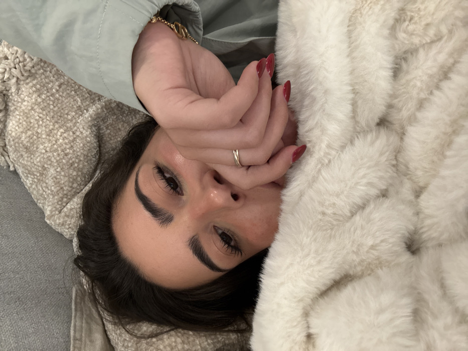 A woman lies on a couch or bed, angled towards the camera. She's partially covered by a fuzzy white blanket. Her dark hair frames her face. Her dark eyes are visible, looking at the camera. Her hand, with red nails and a ring on one finger, is near her face. Part of her body is covered with a light green jacket. A gold bracelet is visible on her wrist. The couch or bed has a neutral, textured covering.