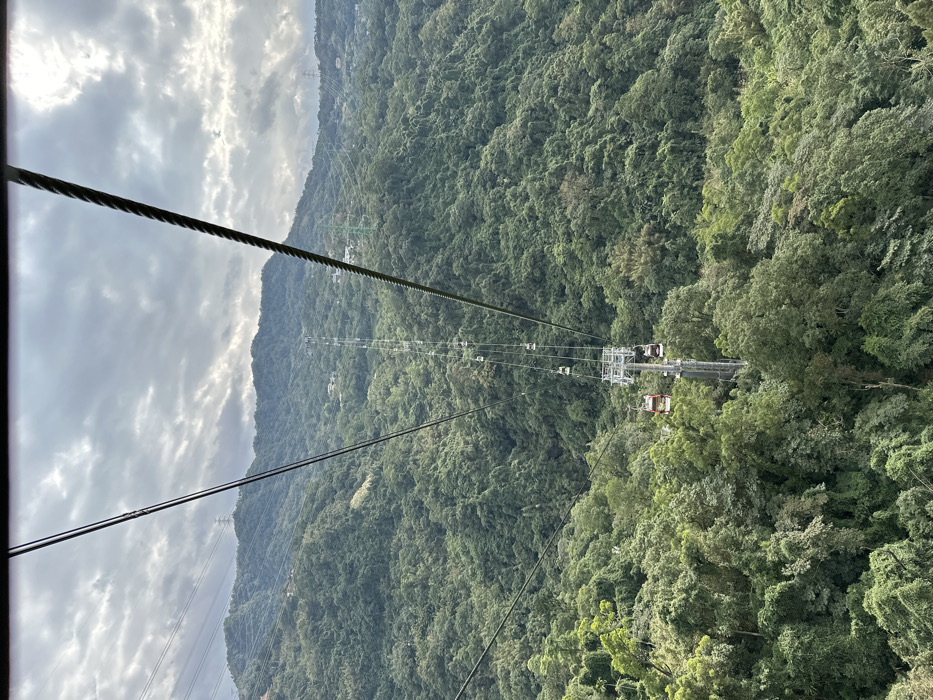 From a high vantage point, likely a cable car, lush, green mountains stretch into the distance under a cloudy sky