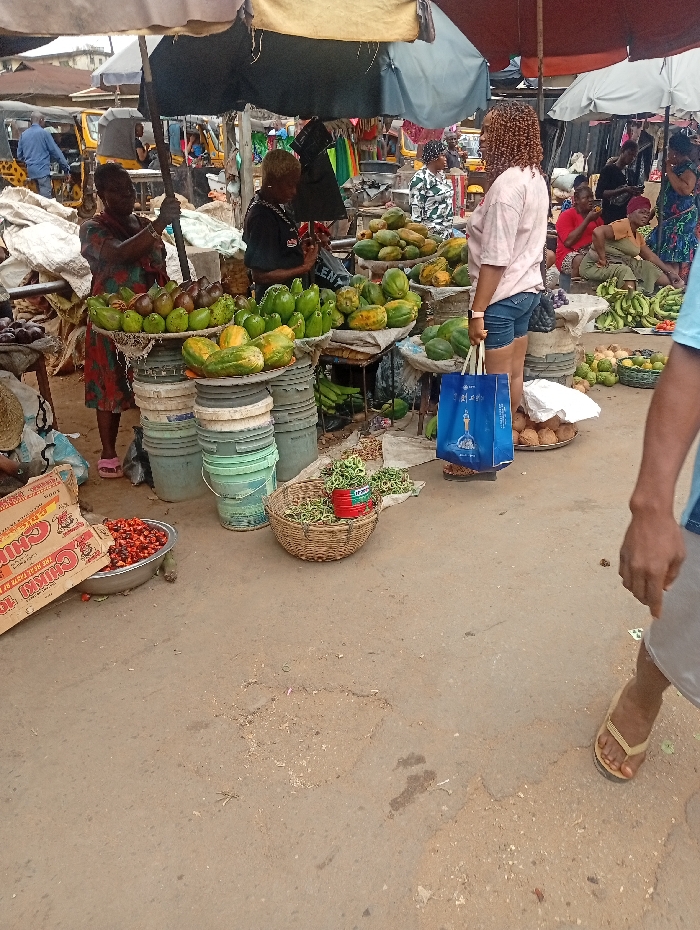 The scene depicts an active outdoor market in Onitsha, Nigeria. The foreground shows a light brown, uneven ground surface with minor debris. A person's lower right leg and foot, wearing a light-colored flip-flop, are partially visible on the right. On the left, a partially visible cardboard box marked "CHINO" rests beside a metal bowl containing numerous small, reddish, spherical objects. A woven basket with green leafy produce and a red cylindrical container is positioned further back. The midground features multiple market stalls operating under varied umbrellas and canopies. A woman with light brown, curly hair, wearing a light pink t-shirt and blue denim shorts, stands facing right, holding a blue shopping bag with a white design. To her left, several elevated displays showcase large quantities of papayas, ranging from green to yellow, arranged on round trays supported by stacked plastic buckets. Green bananas or plantains are also visible. Two women are present behind these displays: one in a patterned dress holds a dark pole, and another in a dark shirt attends to items. The background reveals additional market activity with numerous individuals, further stalls displaying produce like watermelons and coconuts, and several yellow motorized tricycles, indicating a busy urban environment.
