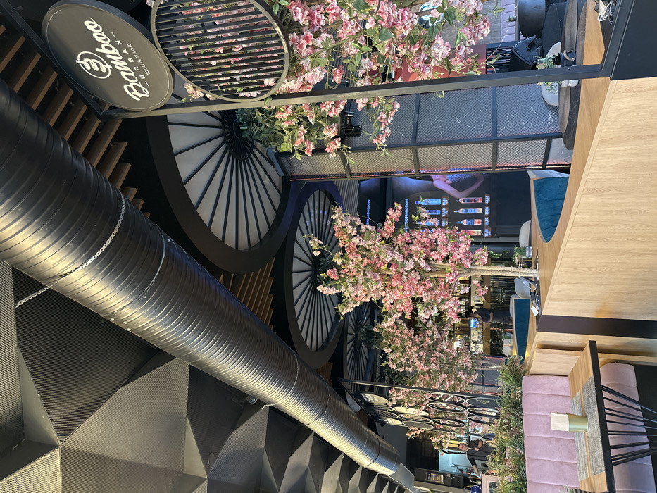 The image depicts the interior of "Bamboo URBAN food & music," a lounge or restaurant located in Sofia, Bulgaria. The scene features a modern and decorative environment with a multi-textured ceiling incorporating dark geometric perforated panels, exposed silver-grey corrugated ductwork, and circular decorative elements resembling wagon wheels with white spokes and black rims. Artificial cherry blossom trees with pink flowers are prominently placed throughout the space, enhancing the decor. In the foreground, a section of pink upholstered booth seating with a light wood table is visible, featuring a small green container on the tabletop. Further into the establishment, dark teal upholstered seating is observed. A bar area is visible in the background, stocked with various bottles. To the right of the bar, a large illuminated or digital display board showcases "EXISTING PROMOTIONS" with liquor bottles and prices, along with a partial image of a person. Two individuals, likely staff members in dark attire, are visible behind the bar: one male on the left standing, and another person further back on the right. Black metal framework structures, some integrated with mesh panels, serve as decorative dividers or supports. The overall impression is an upscale, stylized interior designed for dining and music.
