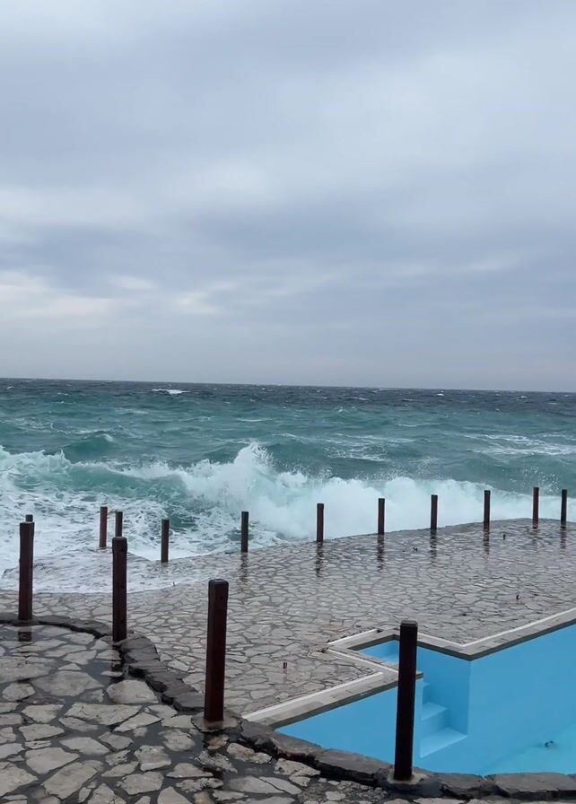 The video depicts a stormy scene at the coast. Turbulent, foamy teal waves crash against a stone-paved platform. Vertical wooden posts line the platform's edge, acting as a rudimentary barrier. Adjacent to the platform is a small, empty, light-blue pool with steps leading into it. The sky is overcast with dark gray clouds, indicative of a stormy weather.